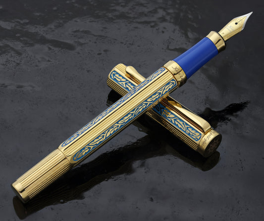 Legionnaire Diamond-Cut Fountain Pen – Finely Hand-Etched Brass, 18K Gold Layered with Egyptian Blue Lacquer, Medium-Fine 0.45 mm Nib