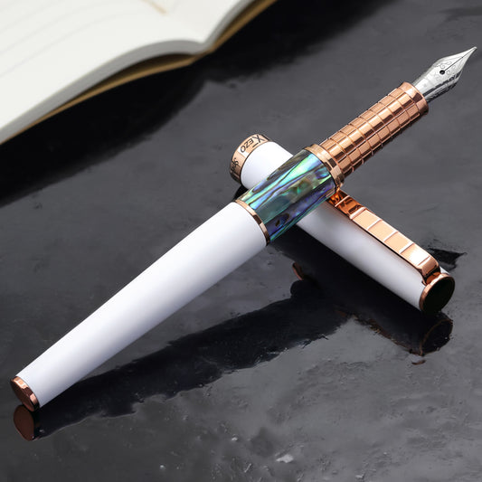 Xezo Speedmaster® White Brass Fountain Pen (Medium Nib) - With Paua Abalone & Rose Gold