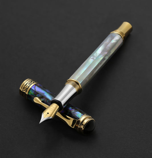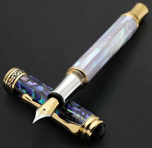 Xezo Maestro® 18K Gold Plated Fountain Pen (Medium Nib) - Oceanic White Mother of Pearl & Paua Abalone