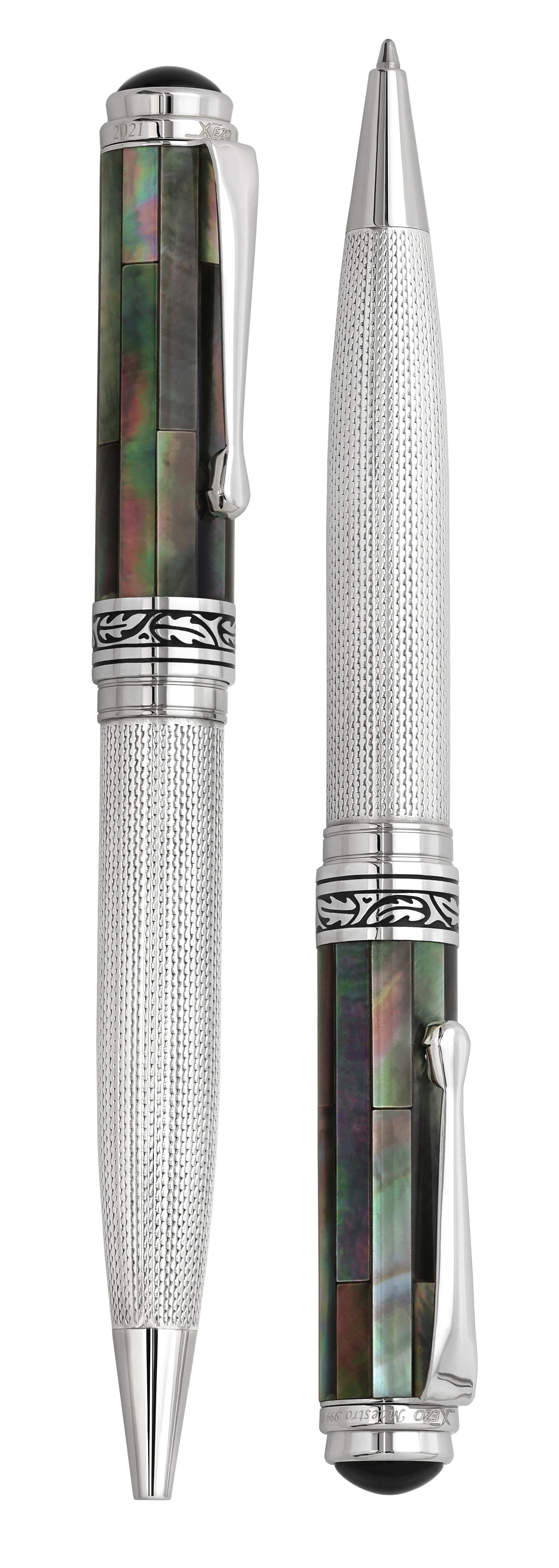 This twist-action ballpoint pen features a cap with hand-inlaid polished panels of genuine black mother of pearl that shine and shift in a spectrum of colors in the light. The round lower barrel is made of solid hand-guilloched, hallmarked 925 sterling silver. The fittings are .999 platinum-plated brass. Each luxury pen is limited edition and serialized.